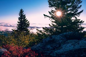 Sunlight filters through the branches of tall evergreens, casting a warm glow over the Bear Rocks region of the Dolly Sods Wilderness Area during a cloud inversion.